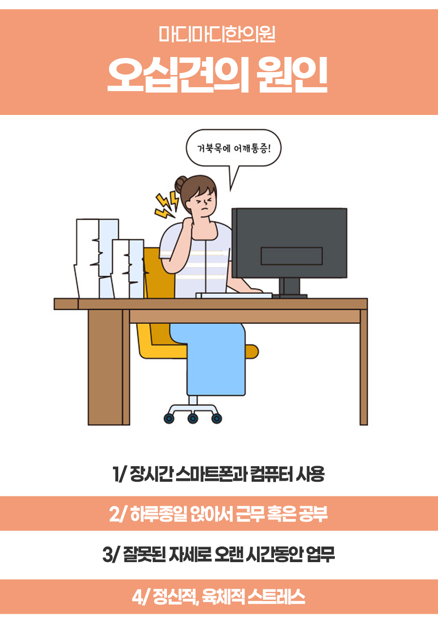 젊은 층에서 나타나는 오십견의 증상은 무리한 운동과 같은 자극에 의해 혹은 팔꿈치 등을 기대면서 어깨에 체중을 싣는 버릇 등으로 인해 어깨가 받는 하중이 심해져 통증이나 증상이 나타나기도 합니다.가능한 한 빨리 증상 초기에 내원하여 관리를 꾸준히 이어가야 했습니다.