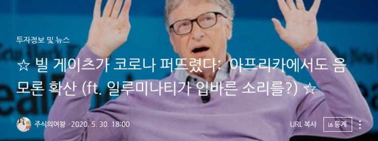 https://blog.naver.com/bhi nvest/221984179060☆게이츠가 코로나를 펼쳤다☆아프리카에서도 음모론 확산 2015년 TED 강연 영상이 ‘코로나… blog.naver.com☆’친구 폰 부서진 상태에서 발견☆’속보’와 손정민의 아버지 ‘친구 폰 망가진 상태에서 발견’ 신발 운동화 증거 인멸 시도? ‘조문도 오지 않았다…’ blog.naver.com