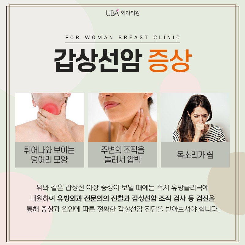 갑상선암은 딱히 특별한 증상이 없어요 일반적인 건강 진단이나 타인에 의해 우연히 발견되는 경우가 많습니다만. 최근 목의 덩어리가 커졌거나 그로 인해 호흡 곤란 등의 문제가 있다면 빠른 검사를 권장합니다. 결절이 딱딱하게 느껴지거나 갑상선암에 대한 가족력이 있는 경우에는 보다 신중한 검사가 필요합니다. 목 앞부분에 둥글게 결절이 튀어나왔거나 이로 인해 주변 조직을 누르고 호흡하거나 음식물 삼키기가 어려운 분, 감기가 아닌데도 쉰 목소리가 나오는 분은 즉시 유방클리닉을 내원하여 유방외과 전문의 진찰과 갑상선 검사비용, 조직검사, 검진방법에 대해 상담하여 주십시오.