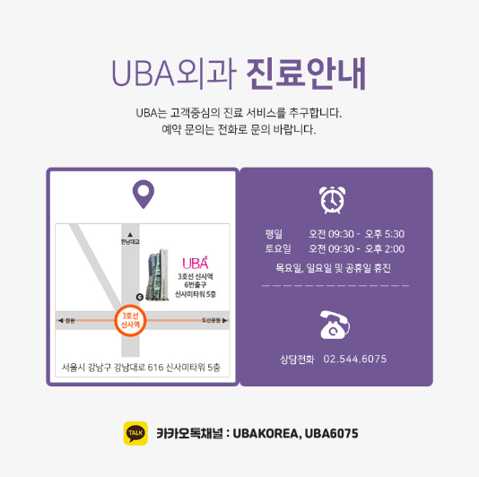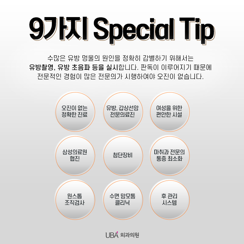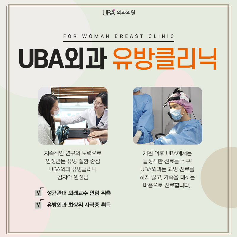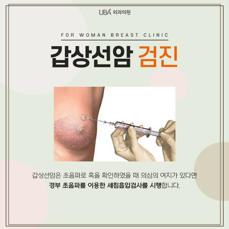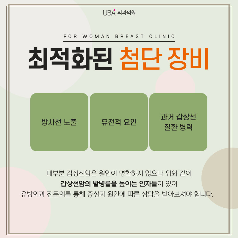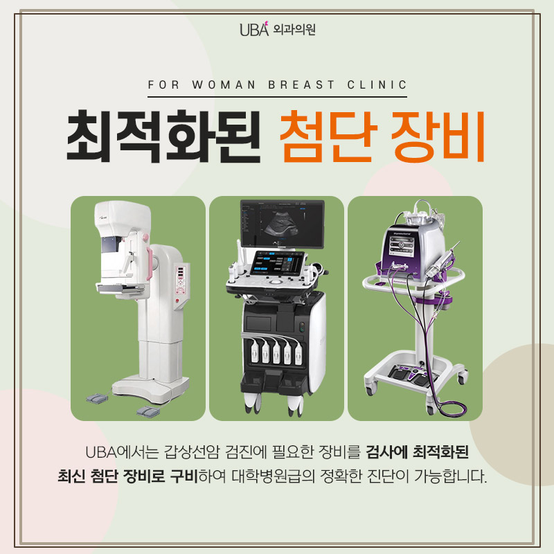 UBA외과는 오직 여성의 유방검진 및 수술만을 시행하는 유방질환 특성화병원으로 검사, 마취, 사후관리에 필요한 첨단장비를 갖추고 있습니다. 갑상선암 검진에 필요한 장비도 최신 첨단 장비로 대학병원급의 정확도 높은 진단이 가능합니다. 정확한 원인이 밝혀지지 않은 갑상선암은 발병률을 높이는 인자가 있으므로 이런 부분은 유방외과 전문의를 통해 증상과 원인에 의한 상담을 받아야 합니다.