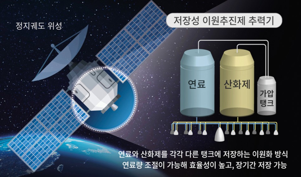 정지궤도 위성은 발사체에서 분리된 후 다음 궤도까지 자체 힘으로 도달해야 하며 15년 이상 극한의 우주 환경에서 작동해야 합니다. 지금까지 정지궤도 위성에 적용되는 이원추진제 추력기는 독일을 비롯한 100% 해외 기술력과 제품에 의존해왔지만 이제 한화가 이 사업에 앞장서 국산화를 추진하고 있습니다.