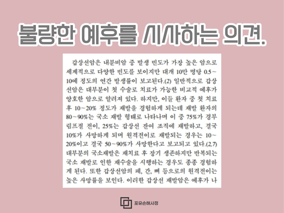그리고 약관상의 규정이나 의뢰자의 진단비 등에 가입하게 된 경위서와 함께 분석하고 근거를 갖추었습니다. 모든 입증자료를 준비한 후에 본 병원은 약관에서 정한 암에 해당한다는 사정서를 함께 작성하여 회사에 제출하였는데,
