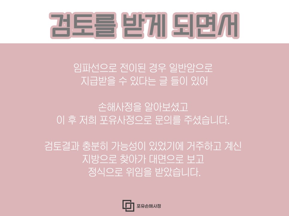 지금까지 몰랐던 자신의 병명을 온라인으로 검색해서 알게 된 사실이 암 진단비를 받는 것은 매우 어려웠지만, 일반 암 진단비를 받을 수도 있다는 내용이었다고 합니다.많은 정보를 알 수 있었다고 합니다그중 무상으로 상담도 하고 검토도 하는 곳(포유)을 선택하면서 저희와의 인연이 만들어지게 된 것입니다.