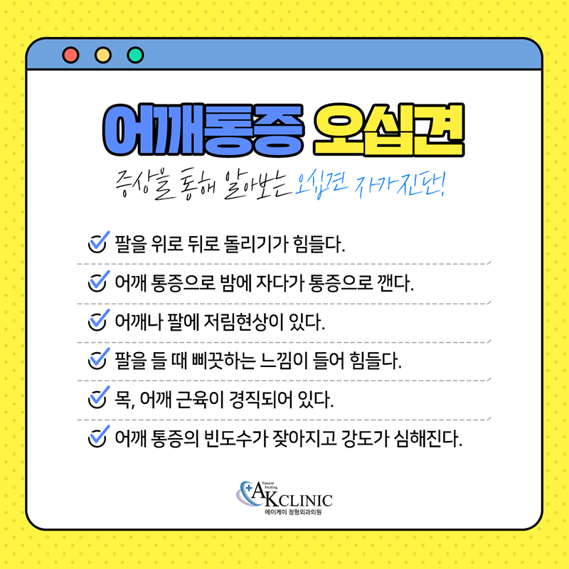 그러나 간혹 통증과 근육통을 착각하는 경우가 있습니다만, 작은 증상이라도 의심된다면 AK성형외과의 세심한 상담을 통해 보다 정밀한 부산 오십견 원인을 찾아 적절한 치료 방법도 제안해 보시기 바랍니다.
