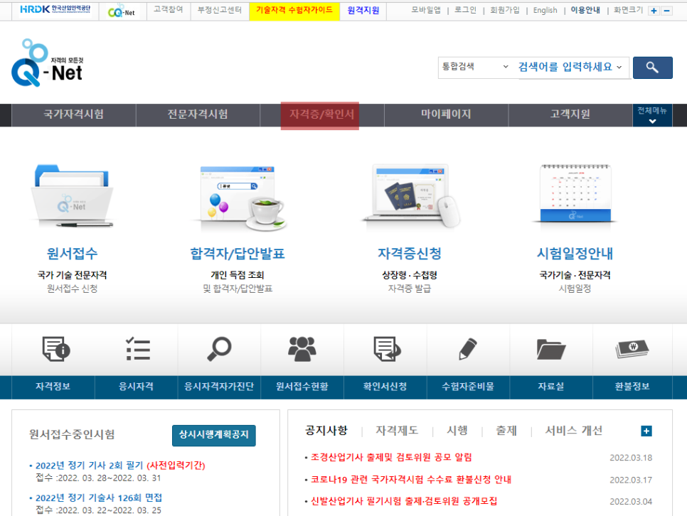 https://www.q-net.or.kr/ 원서접수 국가기술전문자격원서접수신청 합격자/답안발표 개인득점조회 및 합격자/답안발표자격신청 상장형수첩형 자격증 발행시험 일정안내 국가기술전문자격시험 일정자격자진단원서접수상황확인서신청 응시자준비물자료실환불정보 원서접수중 시험공지부 지원서자격제도시행 출제서비스개선 1644-8000:00시행 1일요일 방문접수:주일요일)주일요일 방문접수고객지원서 1644-8000시행안내 및 평일방문접수기간기간기간기간기간기간기간기간기간기간기간기간기간기간기간기간기간기간기간기간기간기간 큐넷 서비스를 미리 체험해 보고 사이트를 간단하게…www.q-net.or.kr 큐넷 홈페이지를 방문하면 된다.