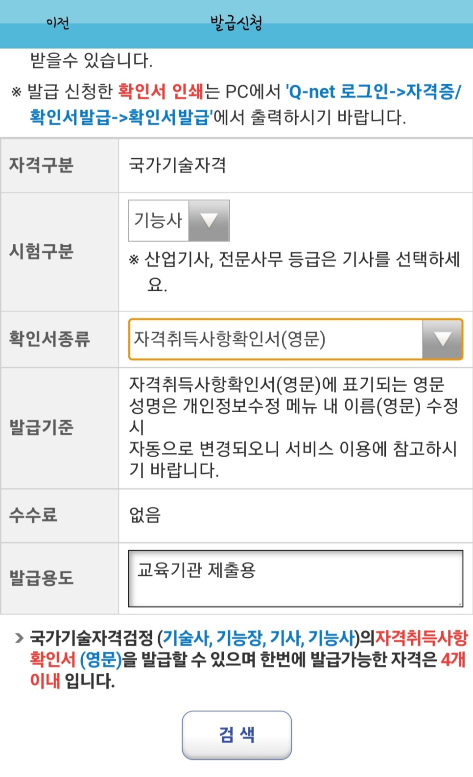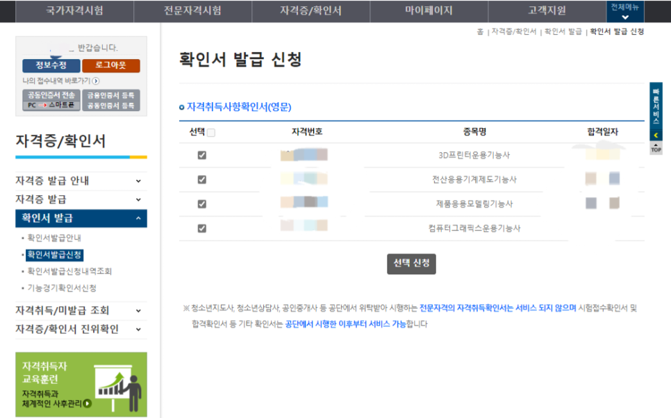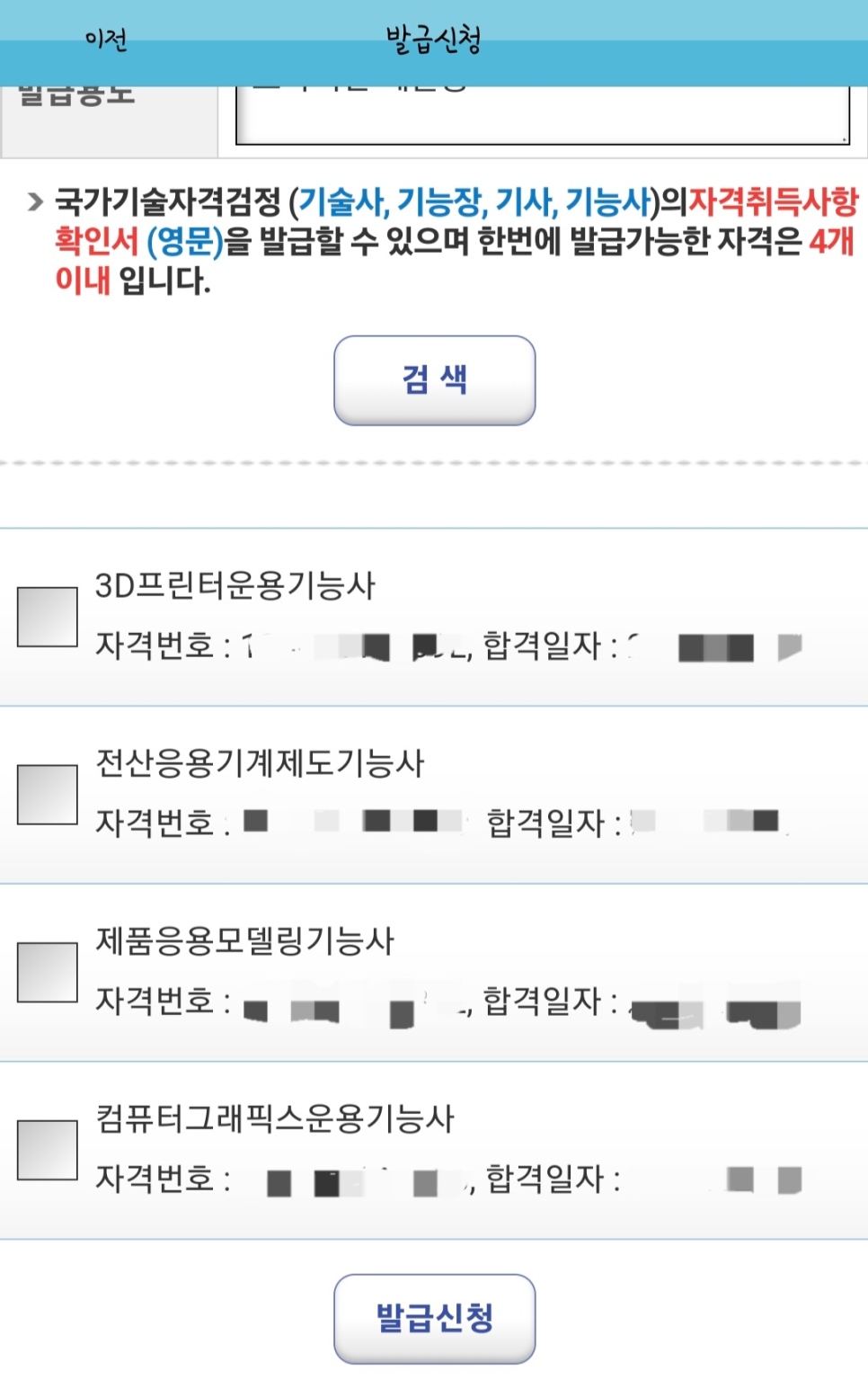 검색하면 내가 취득한 자격증이 나오고 4개까지 한꺼번에 발급 가능하다.