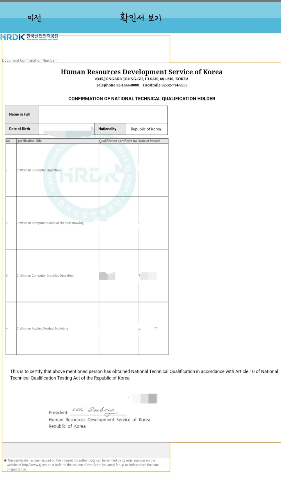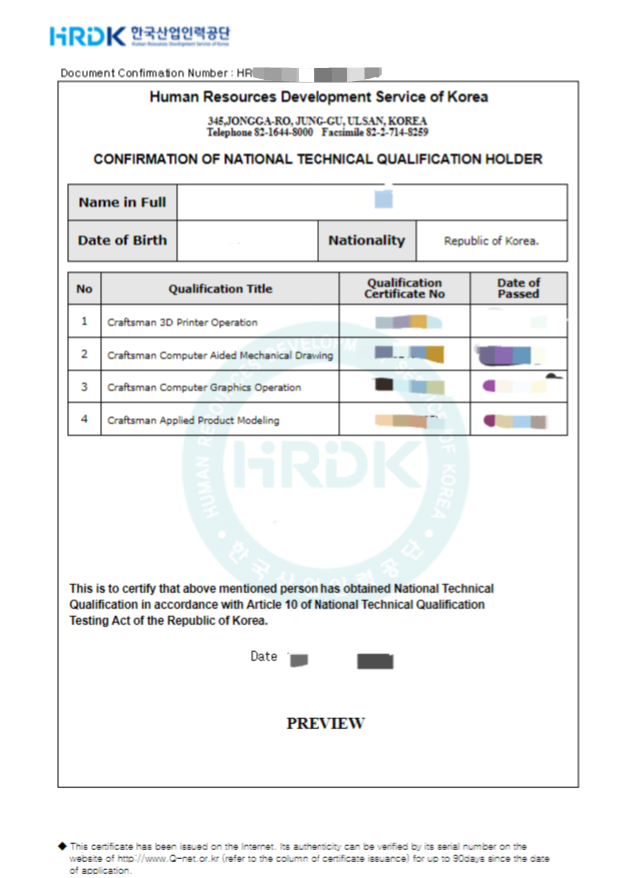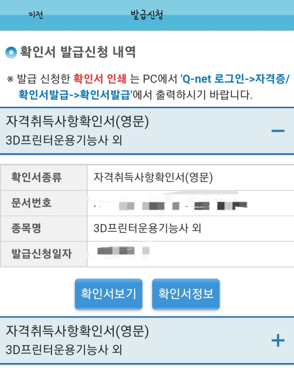 찾아보니 자격증은 큐넷에서 출력할 수 없고 자격취득사항 확인서는 영문으로 출력할 수 있다.