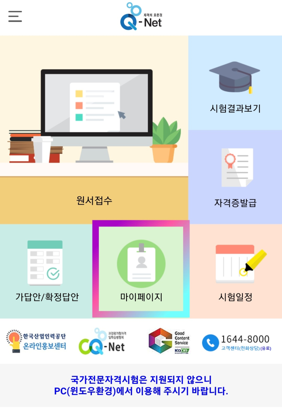 모바일은 기본 인터넷을 통해 큐넷에 들어가는 것이 아니라 큐넷 앱만으로 고를 수 있다.