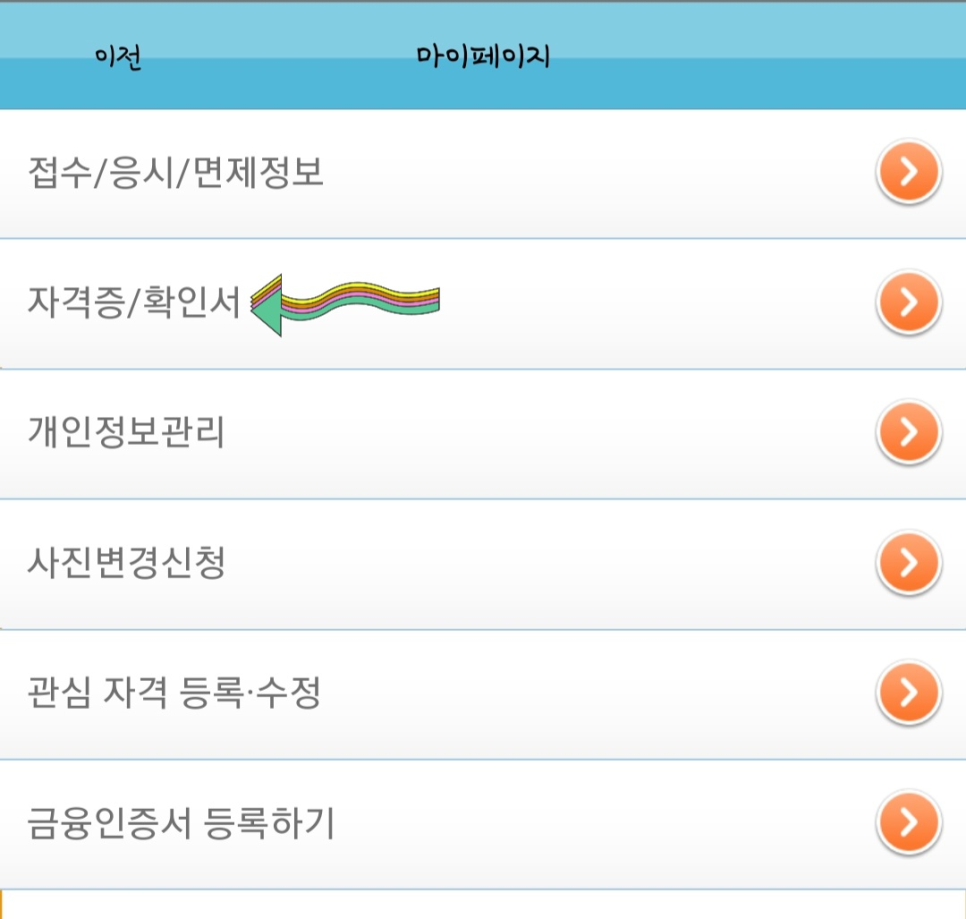 큐넷 앱 로그인 후 마이페이지로 들어가기자격증/확인서에 들어간다.