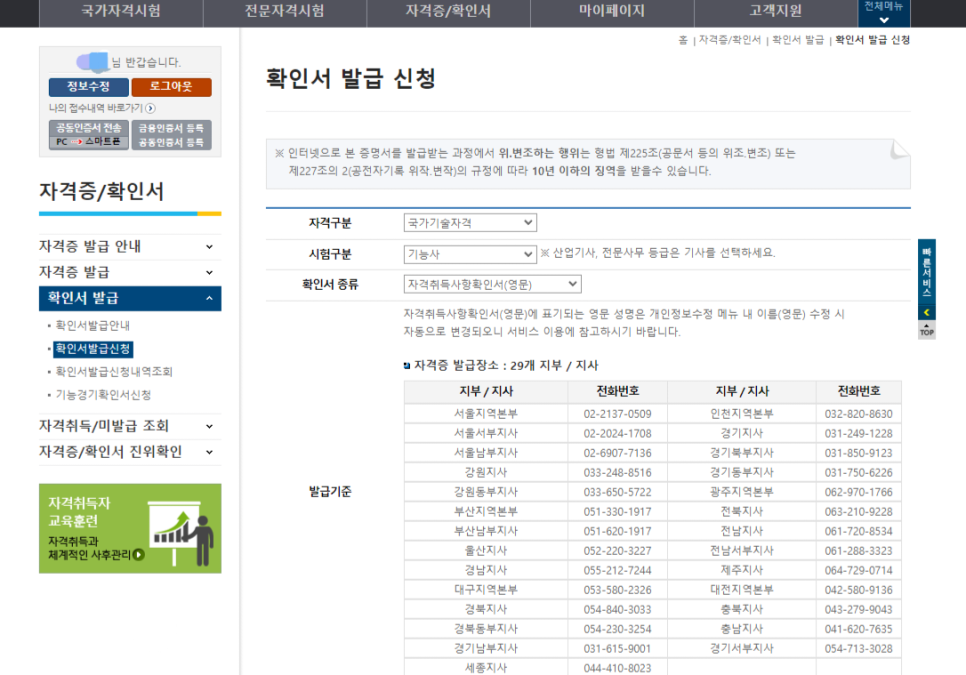 확인서 발급신청으로 들어간 후 본인이 원하는 것을 선택한다.’기능사면’ ‘기능사 기사’처럼 선택하면 된다.
