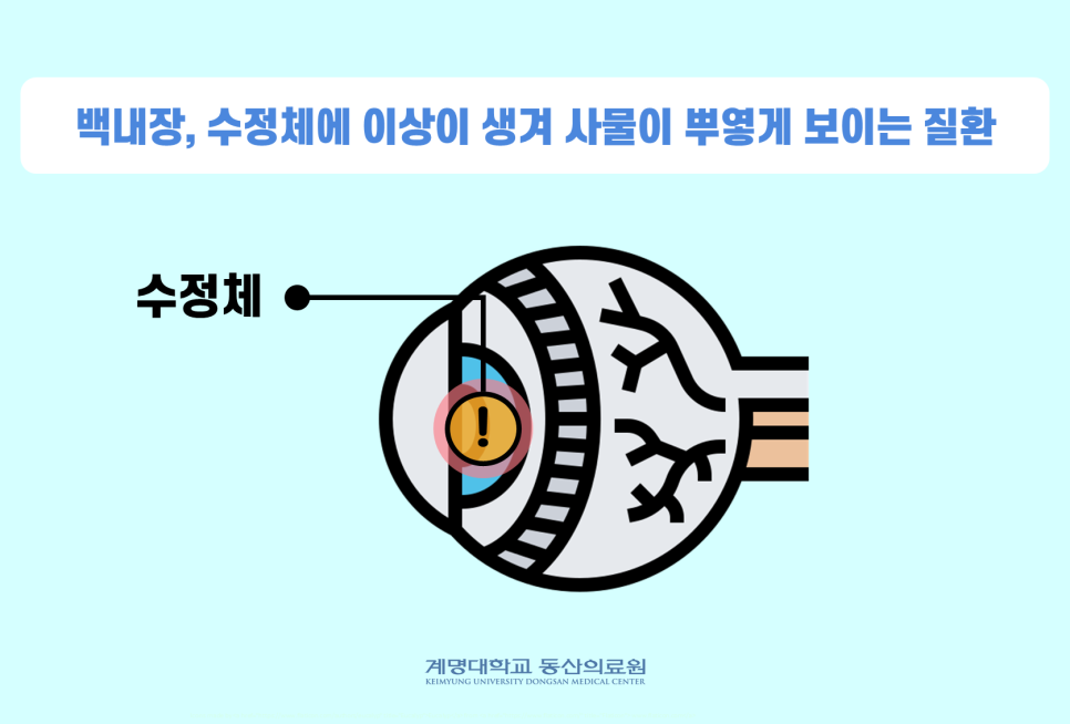 백내장은 사물을 볼 때 초점을 맞추는 역할을 하는 수정체가 노화하거나 염증을 일으켜 눈앞에 안개가 낀 것처럼 사물이 흐릿하게 보이는 질환을 말합니다. 백내장은 유전이나 태내 감염 등에 의한 선천성 백내장이나 노년에 수반하여 발생하는 노년 백내장과 같은 후천성 백내장이 있습니다.