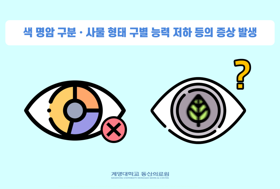 황반변성에 걸리면 선이나 물체가 찌그러져 보이거나 색의 명암을 구별하는 능력이 저하하거나 사물의 형태 구별 능력이 저하됩니다. 또물건을볼때중심부가검게보이기도하고,책을읽을때글씨가연결되지않아서빈칸이생기기도합니다.