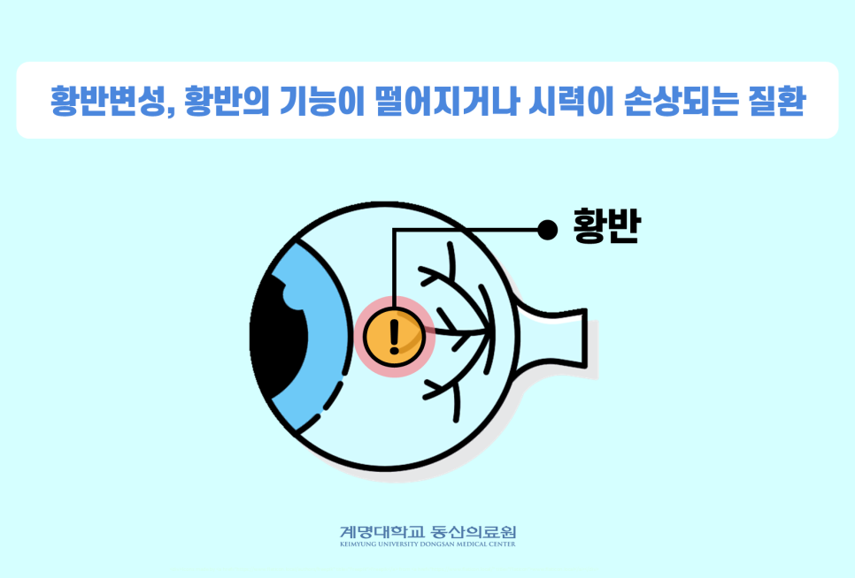 황반변성이란 망막의 중심에 위치하며 사물의 초점이 맺어지는 부분에서 시력에 중요한 역할을 하는 황반이 노화나 유전적인 요인, 또한 독성이나 염증 등에 의해 기능이 저하되거나 시력이 손상됨으로써 심한 경우 시력을 완전히 잃을 수 있습니다.