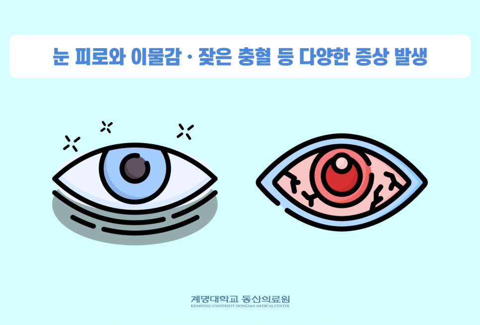안구건조증에 걸리면 눈이 쉽게 피로해지고 이물감과 함께 이유없이 잦은 충혈이 일어납니다. 이외에도 눈이 뻑뻑하고 건조한 느낌, 가려움증이나 시린 증상 등 다양한 증상이 나타납니다.