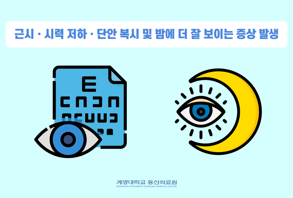 백내장이 진행되면 잘 보이지 않던 작은 글자가 갑자기 잘 보이는 근시 상태가 될 수 있습니다. 또 시력저하와 함께 낮에는 눈부심이 수반돼 백내장의 정도에 따라 낮보다 어두운 곳이나 밤에 잘 보이거나 눈을 감춰도 물체가 2개로 보이는 단안복시 증상이 나타납니다.