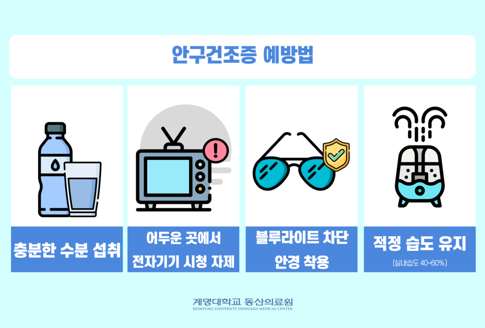 ① 물을 자주 마시고 충분한 물 분 섭취 ② 장시간 어두운 장소에서 스마트폰, TV 시청 자제 ③ 블루 라이트 차단 안경을 착용하여 유해 광선을 차단한다 ④ 실내 습도를 40~60%로 유지하여 건조하지 않도록 한다