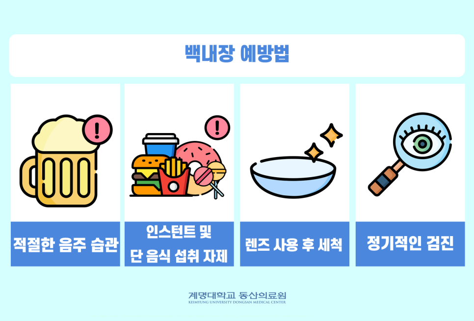 ① 음주 시 횟수와 주량을 제한하여 적절한 음주 습관 유지 ② 칼륨을 감소시키는 단 음식 및 인스턴트 식품 섭취 자제 ③ 외출 후 청결을 유지하고 렌즈 사용 후 철저히 세척 ④ 정기적인 안과 검진으로 눈 건강 상태를 체크