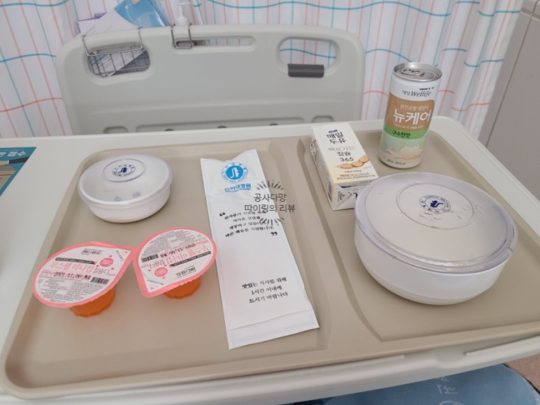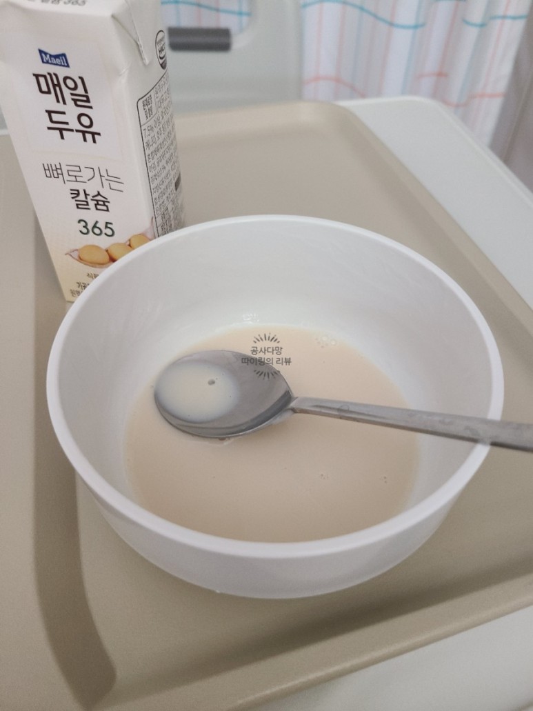 수술은 오전 10시경, 한 끼는 오후 7시) 수술 직후 첫 끼인데 배도 고프지 않고 먹고 싶지도 않다. 그래도 몸 생각해서 미음을 다 마셨고 두유는 빨대로 마시기 힘들어 미음을 마신 그릇에 부어 숟가락으로 떠먹으면 그런대로 나았다.