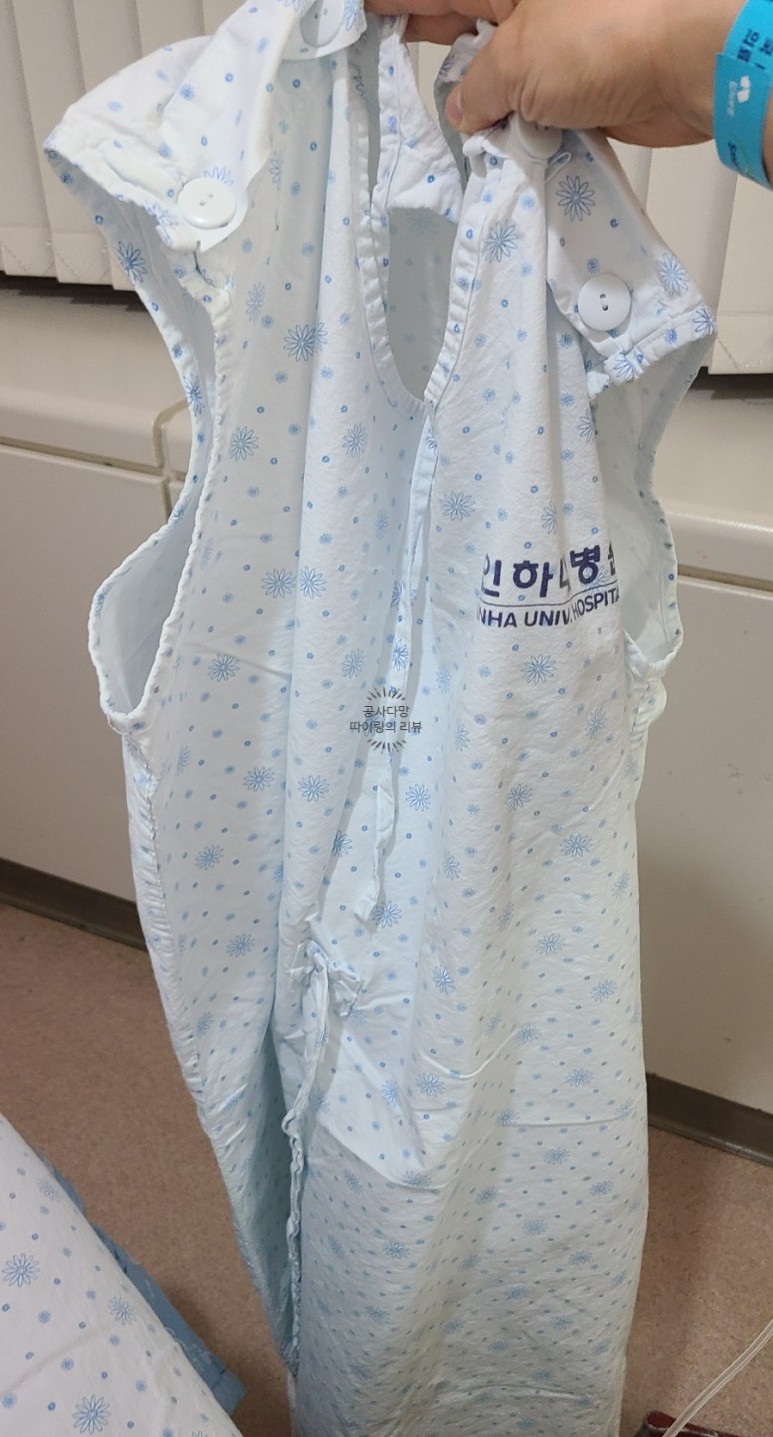 입원 시 수술복이 병실 사물함 옆에 세팅돼 있었다. 수술하는 날 속옷(상하) 모두 탈의하고 상의 병원복만 벗고 수술복으로 갈아입어 간호사 선생님이 도와줬다.