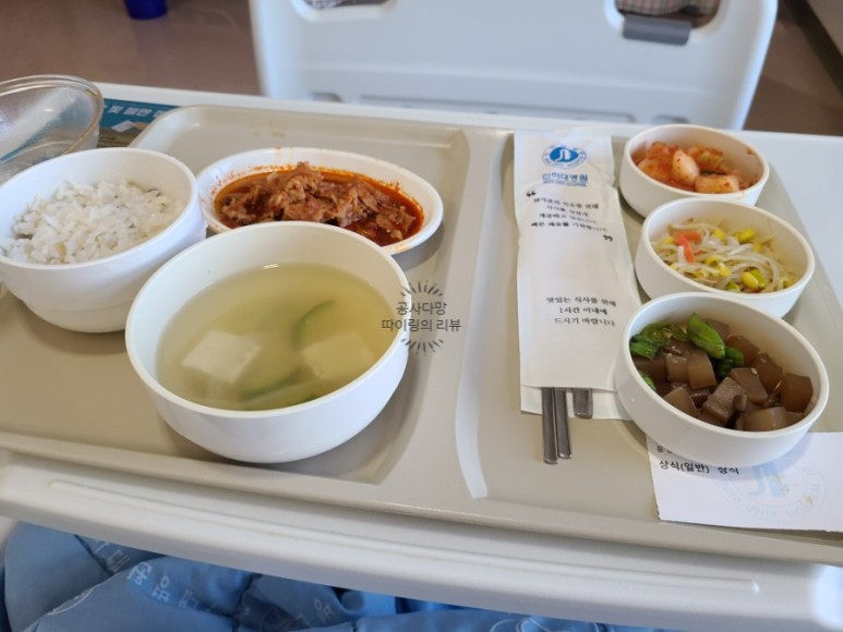 수술 전날은 병원에서 일반식이 나왔다. 최후의 만찬(?)이라면서 맛없는 병원 음식이지만 내일이면 분명 이것도 그리워질 것 같아 엄청 열심히, 든든히 먹었다.