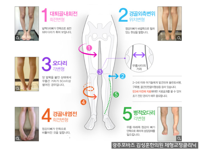 선천적인 이유로 대퇴골 경사각(angle of inclination) 또는 대퇴골 염전각(femurtorsion angle)이 정상 수치로 크거나 작을 경우 X다리, O다리의 형태가 나타날 수 있습니다.
