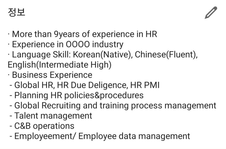 보충입력,채용업무를하면서인재Pool을찾을때는무엇을했나요? 바로 특정 직업군을 검색했을 때 사용한 키워드 검색이다. 권 과장은 그동안 인사 업무를 하면서 맡은 업무를 영문으로 120자 이내로 작성한다.(내가 맡은 업무 중 가장 ‘강점’ 있고 자신할 만한 업무 순으로 작성한다.)