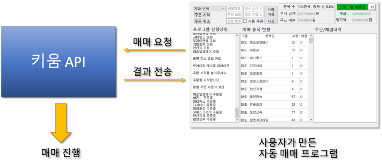 사용자가 직접 작성한 프로그램을 통하여 시세 조회/잔액/조회/주문 등을 할 수 있도록 제공하는 서비스로 MTS, HTS를 거치지 않고도 주식을 매매할 수 있는 서비스입니다.
