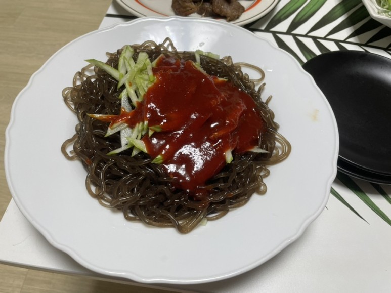 물냉면, 비빔냉면, 메밀냉면 또는 두유소면 등 다양하게 즐길 수 있습니다.저는 먼저 떡국을 먹어 보기로 했습니다.떡국을 오이와 양념을 넣고 비빔냉면으로 즐기기로 했어요.양념장은 면발과 함께 판매하여 편리했습니다. ㅎ