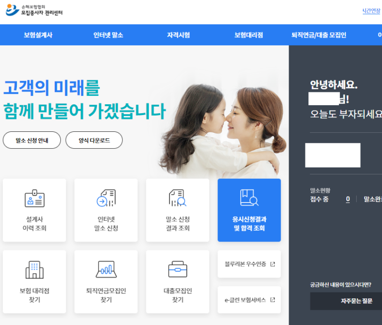 https://isi.knia.or.kr/index.do 고객의 미래를 함께 만들어 갑니다. 말소신청 안내양식 다운로드 설계사 이력조회, 인터넷 말소신청결과조회, 응시신청결과 및 합격조회 보험대리점 찾기, 퇴직연금 모집인 찾기, 대출모집인 찾기, 블루리본 우수인증, knia.or.kr 손해보험협회 모집종사자 관리센터에 들어가 응시신청결과 및 합격조회를 눌러