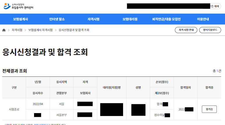 합격조회 합격여부조회는 시험을 본 다음날 오후 6시에 손해보험협회 홈페이지에서 조회가 가능하다.(+당일 오후8시부터 조회가 가능할 것 같다.)