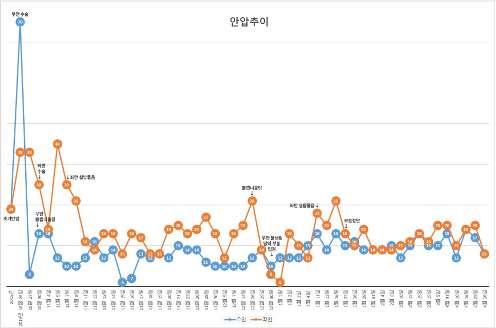 2015년: 양안안압24로 녹내장 진단 2019년 10월 23일: 심한 두통으로 응급실로. 신경외과에 입원하여 MRI, MRA 촬영. 당시 안압이 70/40이었지만, 안과가 아닌 신경외과에 입원하는 바람에 폐쇄 각 녹내장 수술의 골든타임을 놓쳤다. 무려 4일이나 허비.2019년 10월 26일 : 안과 재입원, 우안섬유주절제술 2019년 10월 30일 : 좌안섬유주절제술 2020년 1월 22일 : 수술 후 안압이 불안정하여 대학병원으로 이전 진료.좌안의 안압이 높다. 우안도 안압이 올라갈 것이다. 안약 점안하며 한 달을 지켜본 뒤 재수술을 결정하자고 했다.2020년 1월 23일: 자의적인 판단으로 코소브 추가 점안 개시의 안약이 효과가 있었던 듯하나, 다시 상향 전환 2020년 3월 31일: 교수가 안압 18/20으로 수술을 결정하기에는 애매한 수치라고 하자, “소브&자로스트 점안하여 1개월 후에 수술을 결정하겠다” 속셈 2020년 4월 29일: 알파간 추가&2개월 후에 재결정.