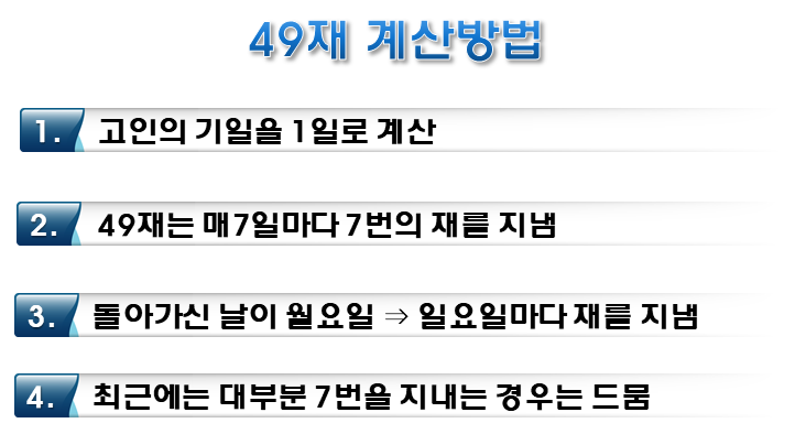 돌아가신 날을 하루로 7일, 14일, 21일, 28일, 35일 42일, 49일 총 7번의 제사를 지내며 49재계산 방법을 쉽게 이해할 수 있습니다.