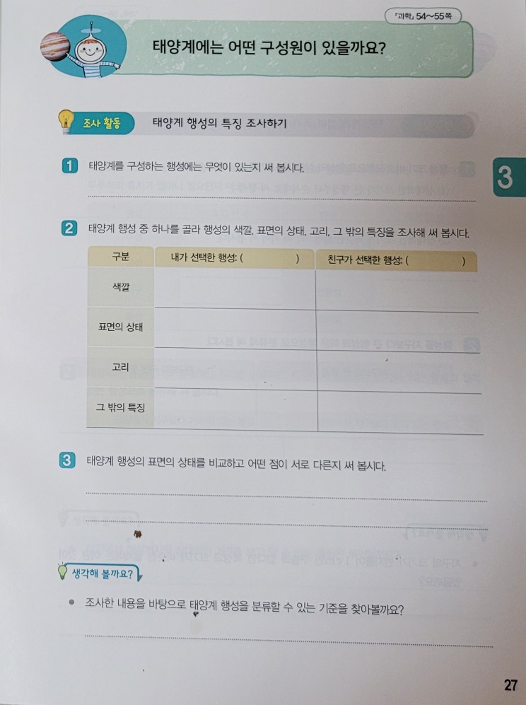 1. 태양계를 구성하는 행성에는 무엇이 있는지 알아봅시다. 태양계 행성 중 하나를 선택해서 행성의 색상, 표면 상태, 고리, 기타 특징을 알아봅시다.3. 조사한 내용을 친구와 함께 이야기해 봅시다. 4. 태양계 행성의 표면 상태를 비교하여 어떤 점이 다른지 이야기해 봅시다.