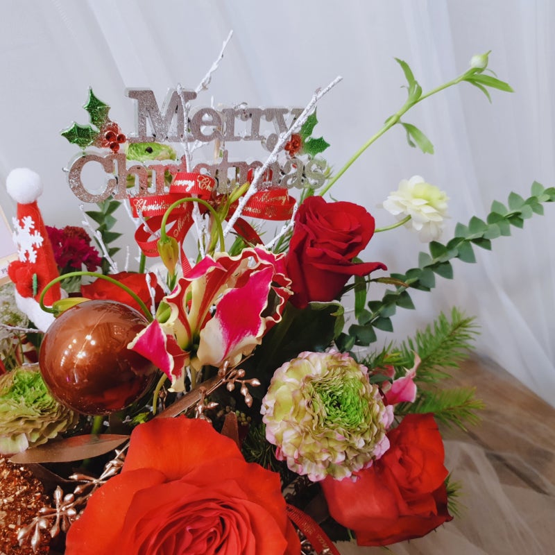 눈사람을 포인트로 크리스마스 하면 떠오르는 색감의 레드와 화이트를 믹스하여 꽃바구니를 제작하였습니다.크리스마스 이브 오전에 어머니께 깜짝 선물로 드린 크리스마스 선물입니다.