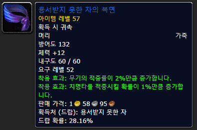 머리는 솔룸 정문에 허락받지 못한 자가 주는 이 가죽 아이템이 최고인 것 같아요Biss 아이템을 보면 1위의 적중, 2위의 치명타, 3위의 전투력 같아요.일단 치명타는 격렬함으로 레이드하는 데 필요한 스텝이기 때문에 이 아이템은 아주 좋은 아이템입니다이것만큼 좋은 아이템이 없으니까 이걸 쓰세요~