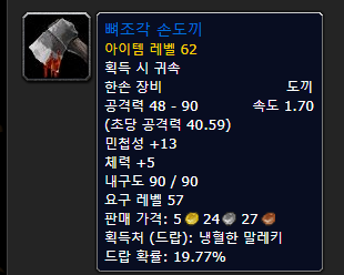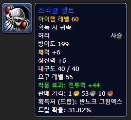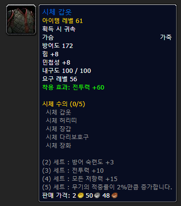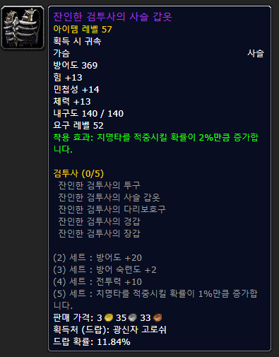 흉부 보호구이지만 잔인한 검수 다른 쇄갑옷이나 록 투기장에서 나오는 광신자 그로시가 주는 아이템인데 이는 거의 획득 불가능합니다… 투기장을 얼마나 돌아다녀야 할지도 모르고 투기장에 가도 광신자 그로시가 나올 확률은 매우 낮습니다. 에픽답게 아이템은 아주 좋지만 먹을 확률이 극히 적어 60렙 찍으면 나락은 사실상 거의 가지 않기 때문에 차선책으로 시체 갑옷을 드시는 것을 추천합니다!