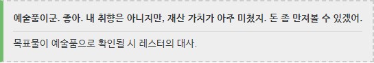 인원이 2명이라도 쉽고 빠르게 가져갈 수 있는 목표물로 엘리트를 하기에 최적의 목표입니다.해커 역할을 줄이고 수익을 극대화해도 어렵지 않게 다 챙길 수 있습니다.어렵고 5% 중급자 해커인 요한만 사용해도 둘 중 한 명이라도 해킹 숙련자라면 시간이 충분히 남을 정도로 매우 여유가 있습니다.만약 초숙련자 2명이 합류하면 3프로 리키를 사용해도 아슬아슬하게 빠져나갈 수 있고 반대로 해킹이 미숙한 초보자만 모였더라도 프로해커를 사용하면 모두 훔칠 수 있습니다.숙련자들은 개인 금고 여러 개도 충분히 열어올 수 있고 예술품만의 독보적인 장점은 빨리 넣기 위해 카트마다 손을 아프게 반복해야 하는 다른 목표물과 달리 키 네 번 눌러 예술품을 하나씩 잡을 수 있어 손이 매우 편하고 덕분에 다른 목표 뮬보다 훨씬 빨리 구할 수 있어 나갈 때 기동력 감소가 크지 않다는 점이 있습니다.이러한 예술품만의 독보적인 장점이 있기 때문에 잠재수입은 금괴보다 적지만 금괴 2명이라도 프로해커를 고용할 수밖에 없고 85% 기준으로 수익차가 크지 않아 플레이어 선호도가 상당히 높다.
