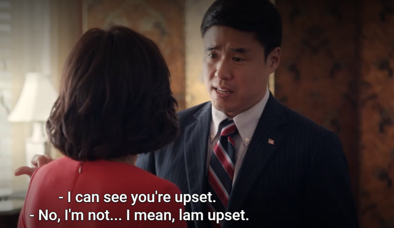 (a) Icansee you’reupset. 화가 났나봐요.(b)(b) No, I’m not…Imean, Iamupset. 아니요, 화가 나네요. 미국의 HBO 드라마 “부통령이 필요해 VEEP”의