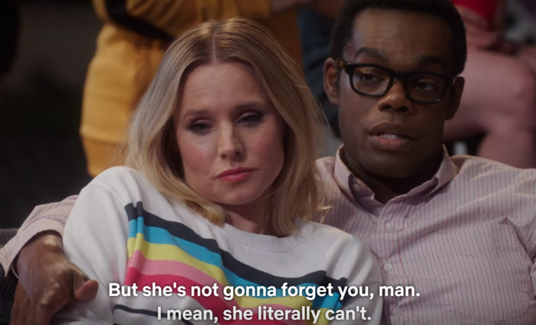 But she’s not gonna forget you, man. Imean, sheliterally can’t. 하지만 자넷은 잊을 수 없어. 내 말은 잊을 수 없어. <추가 설명을 하면서> 미국 NBC 드라마 <굿플레이스 The Good Place>에서