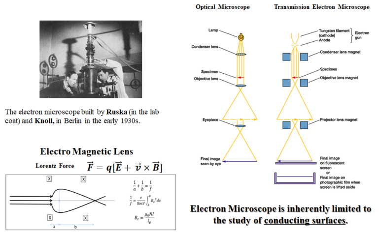 Optical MicroscopeElectron MicroscopeLight sourceWave lengthTransmitting mediumLensAperture AngularResolutionMagnificationVisible light 7 , 500 Ȧ ~ 2 , 000 ȦAirGlass Lens ~ 70 ‘ 2 , 000 Ȧ 10X ~ 2 , 000 XElectron beam 0 . 0859 ~ 0 . 0251 ȦVacuumElectromagnetic lens ~ 35 ‘ 3 . 5 Ȧ 100 X ~ 450 , 000 X 하지만 , 이렇게 좋은 SEM 에도 단점은 존재하였다 .