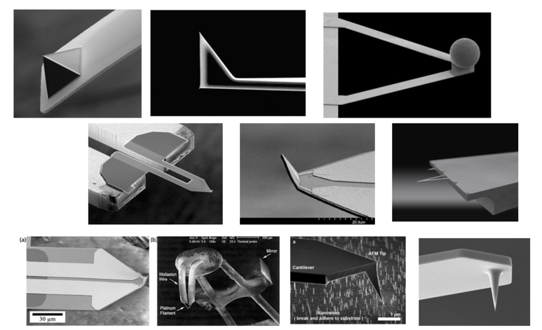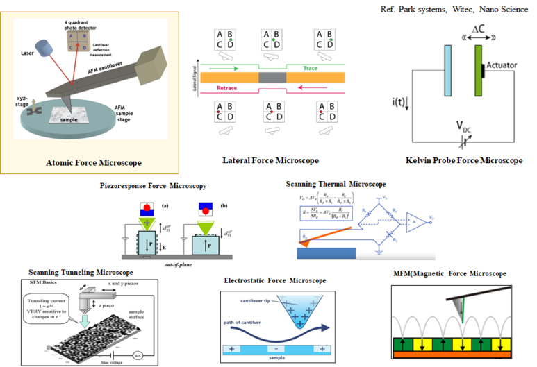 시료를 접할 수 있어 다양한 응용분야가 개척된다. 기본적인 Atomic forcemicroscope(topograph)을 비롯하여, 시료의 부분적 마찰력을 측정할 수 있는 Lateral forcemicroscope, 표면의 potential energy(Workfunction)을 측정할 수 있는 Kelvinprobeforcemicroscope, piezo물질의 부피 변화 Vs. 전압 변화를 측정할 수 있는 piezoresponseforce microscoopy, 시료의 국부 온도를 측정할 수 있는 Scanning thermal microscopy, 시료 표면과 팀 간의 tunneling current를 측정하는 scanning tunneling microscoopy전기장 변화를 측정할 수 있는 electrosticforscopy전기장 변화를 측정할 수 있는 electrostic