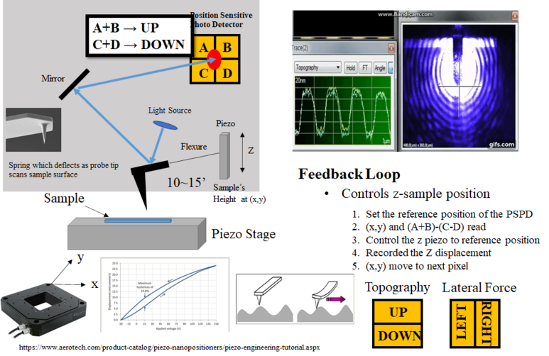 이 중 가장 기본이 되는 AFM은 아주 작은 탐촉자(cantilever)와 cantilever의 위치를 확인할 수 있도록 light source (Super luminescence diode, SLD or Laser)와 position sensitive photodetector의 위치를 확인할 수 있도록 light source (Super luminescence diode, SLD or Laser)와 piepiepiepiepiepiepiepo)와 pzo)로 구성되며, zo)로 구성되며, zo