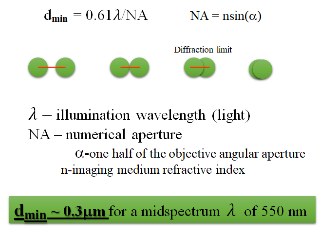 550 nm (녹색) 빛의 회절 한계는 대략 300 nm 정도로 그 이하의 물체를 관찰하기에는 가시광선으로는 쉽지 않음을 알 수 있다.