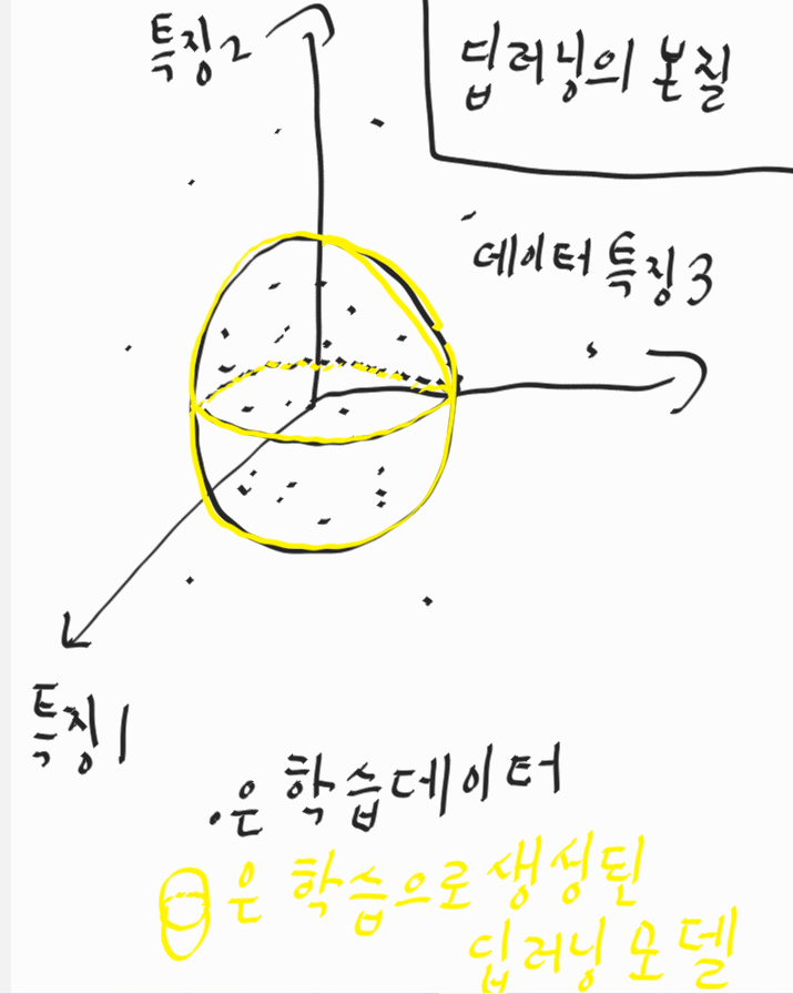 노란 원은 학습을 통해 만들어진 딥러닝 알고리즘(모델)을 의미한다고 생각합니다.