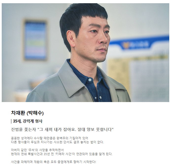 특별수사본부 팀장으로 나오는데 냉철하고 날카로운 직감으로 합리적이고 이성적으로 바라보며 극의 중심을 잘 잡아주고 있어 특히 눈이 간다.