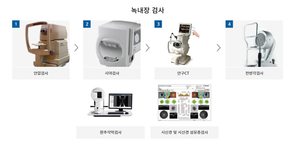 녹내장 진단을 위해서는 안압, 전방각경, 시야검사,
