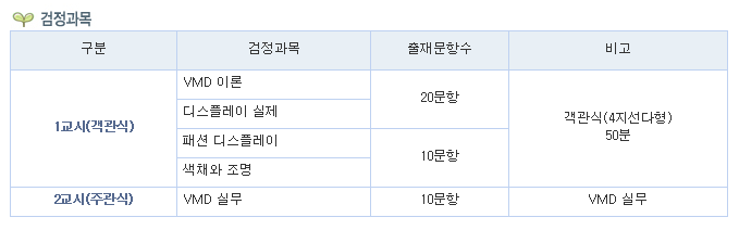 비주얼 머천다이징(VMD) 자격은 한국직업연구진흥원에서 주관하는 민간자격증입니다.학력, 경력, 연령 제한이 없는 누구나 응시할 수 있는 자격증입니다.1, 2교시 모두 절대평가에서 60점 이상이면 합격이고, 2교시 불합격일 경우 다음 회사 시험에서 3회차까지는 1교시를 제외한 2교시 수업만 응시 가능합니다.