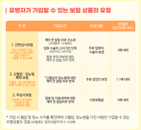 ● 고혈압·당뇨병 특화 고혈압 및 당뇨병에 대한 알릴 의무가 면제됩니다.** 주로 유병자 암보험에 가입할 수 있습니다.