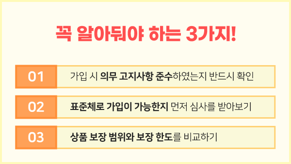 2) 표준체로 가입할 수 있는지 확인도 필수! 유병자의 상품은 적게는 2배, 많게는 4~5배까지 보험료 차이가 발생할 수 있습니다. 따라서 표준체, 건강체 가입이 가능한지 먼저 심사를 받아보는 것이 좋습니다.